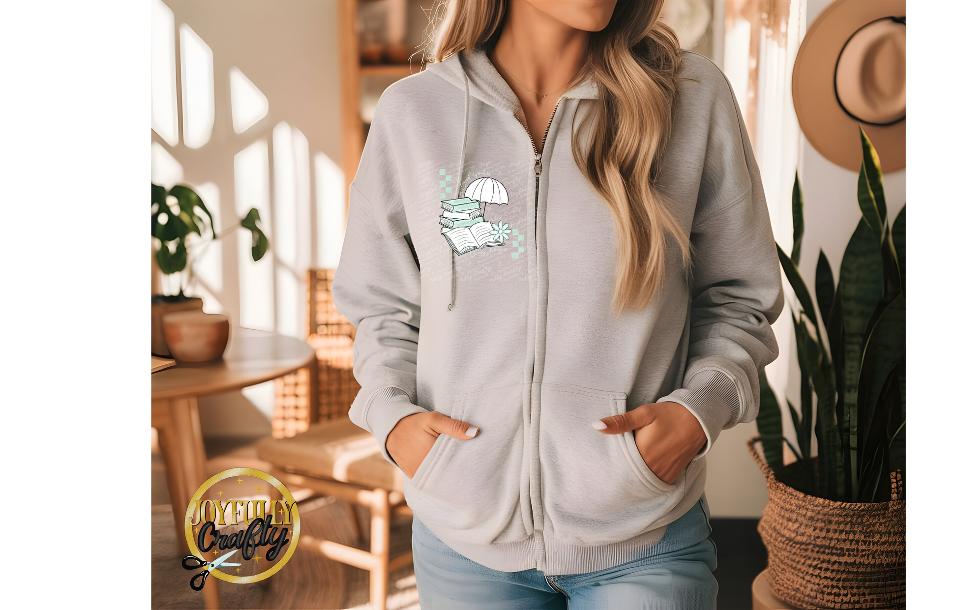 Good Books and Rainy Days Adult Zip Up Hoodie Pocket Design